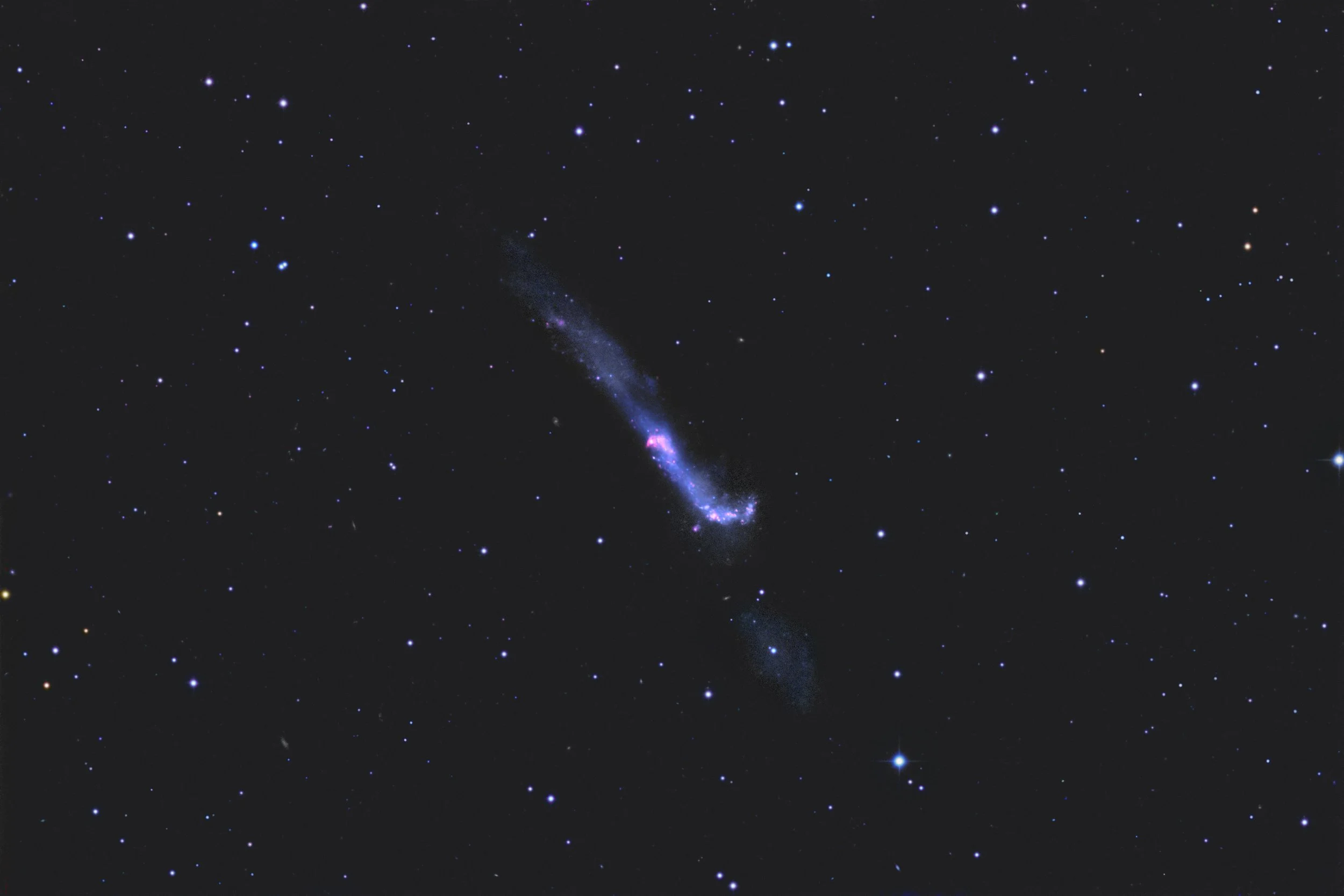 NGC 4565 is a distorted edge-on barred spiral galaxy lying 30 million light-years from Earth in the constellation Canes Venatici. Its distorted shape resembles that of a hockey stick. It is thought that this distortion is due to gravitational interaction with NGC 4631, The Whale Galaxy (see my image of NGC 4631). Both are undergoing bursts of star formation as a result of the interaction, as can be seen by the numerous bright red emission nebulae forming stars within the hockey stick. The blue star cloud below the hockey stick may not be part of NGC 4565, but is likely a dwarf galaxy in the process of merging with NGC 4656.