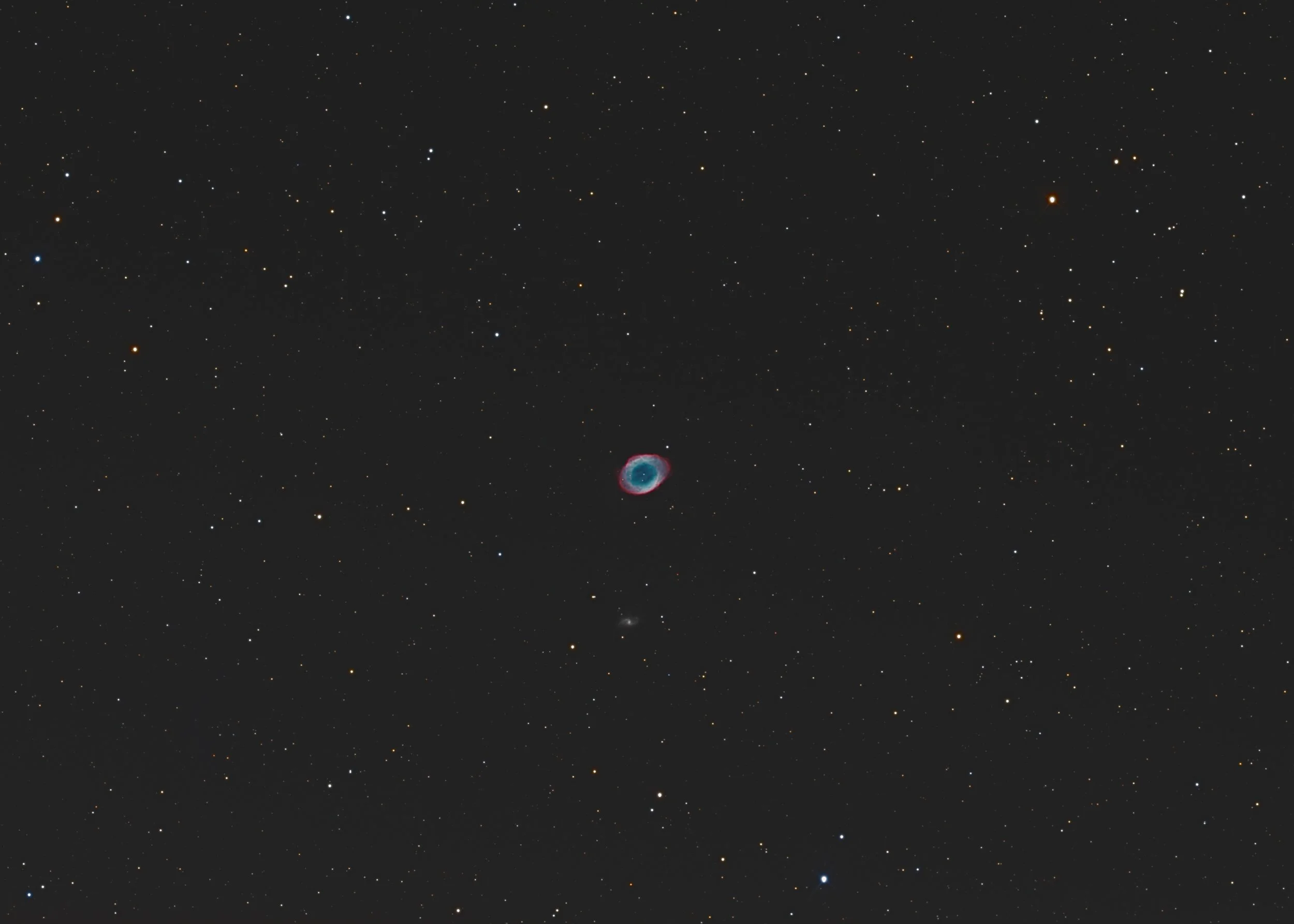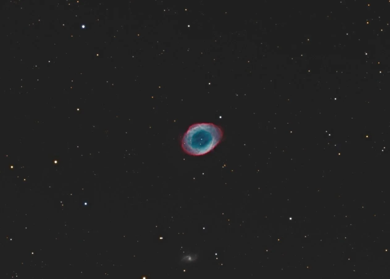 The Ring Nebula is a planetary nebula in Lyra situated halfway between the stars Sulafat and Sheliak in Lyra. The nebula is a shell of gas shed by a star with mass similar to that of the sun at the end of its red giant phase. This leaves a white dwarf at the center. The nebula lies at a distance of 2.500 light-years and has been expanding for about 1600 years. Although most popular images taken by the Hubble Space Telescope or major ground-based observatories depict it as being very large, it is actually very small in the sky, being only 1.5 arc minutes in diameter. A zoomed in view is also posted on this website that resembles those popular images. The spiral galaxy below it is IC 1296 which lies 238 million light-years from Earth.