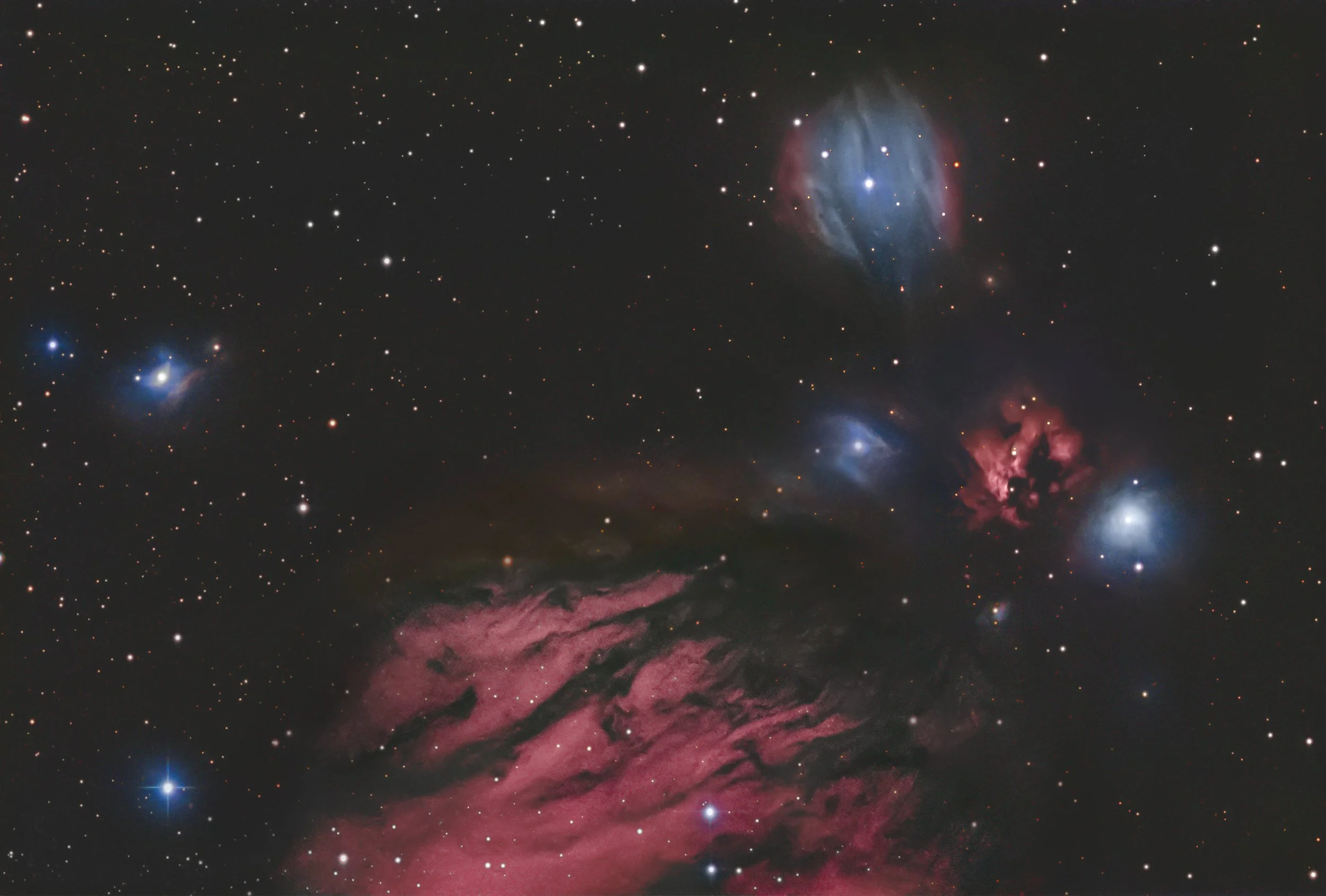 One can see the entire process of new star formation in this view of the iconic Horsehead Nebula in Orion. The blue supergiants star Sigma Orionis, which is above the field of view, is emitting intense ultraviolet radiation that is ionizing the hydrogen in the emission nebula IC 434, causing it to glow red at a wavelength of 656.28 nm. That star is also emitting fierce stellar winds that are creating wisps and streaks within the nebula and also cause it to pile up as a shock wave as it encounters the resistance of the large dark molecular dust cloud, Lynds Dark Nebula 1630. However, there are some persistent intrusions of the dark nebula into the emission nebula, such as the Horsehead Nebula itself. As the fierces stellar winds continue to apply pressure to the edges of these intrusions, the hydrogen within them becomes compressed and eventually gravity takes over and the hydrogen collapses into a newborn star.
