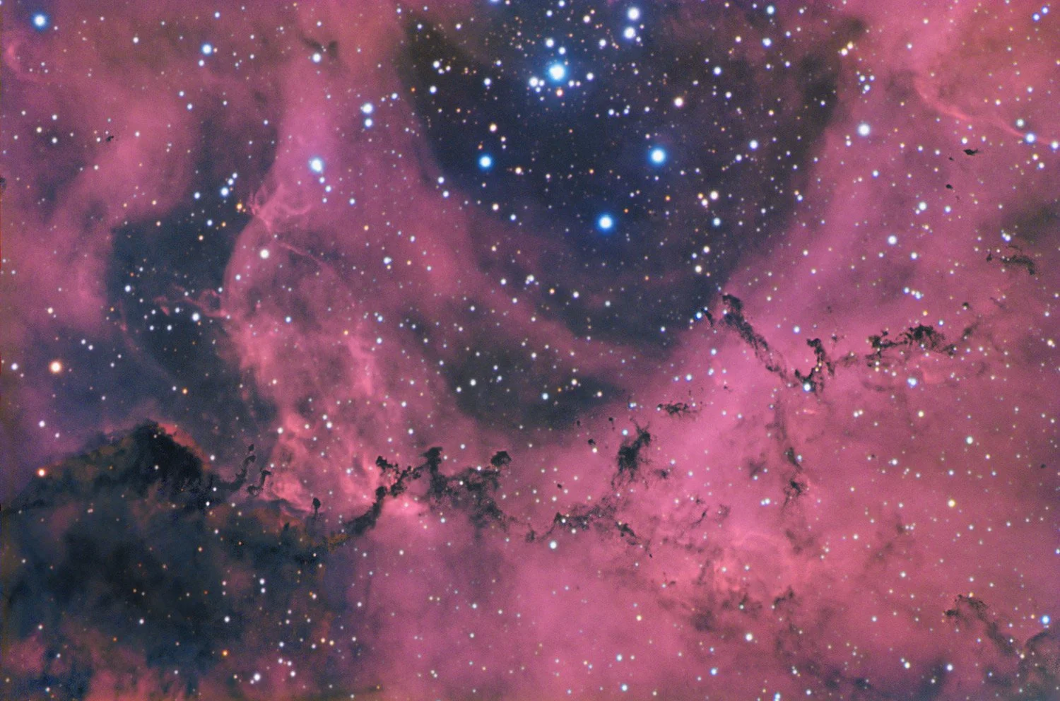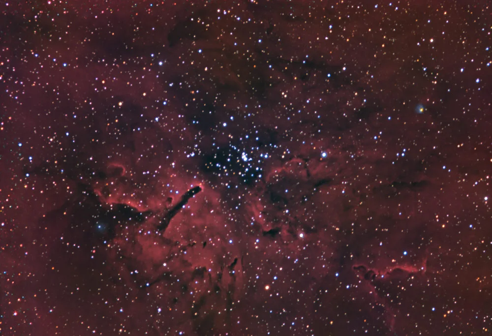 NGC 6820 is a star forming region in the constellation Vulpecula, the fox. It is one of the rare regions in the sky that shows all three types of nebulae, red emission, blue reflection, and dark, within a single frame. The nebula has already spawned the bright cluster of hot blue stars, NGC 6823 in the center of the image. Stellar winds from this cluster are sculpting various pillars of gas and dust within the cloud, including one long, large dark elephant trunk of dust to lower left of center. This is one of the largest such structures visible from Earth and appears much larger than the famous “Pillars of Creation” in M16, the Eagle Nebula, yet hardly anyone is aware of this much better example. The nebula and cluster lie 6,000 light-years from Earth.